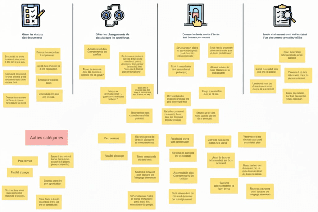 Documentation spécialisée, contenus d’experts et retours en ligne : cette recherche documentaire était indispensable pour comprendre un sujet complexe, partager ses enjeux avec l’équipe, challenger les premières pistes proposées par les PO et mieux préparer les ateliers d’idéation.